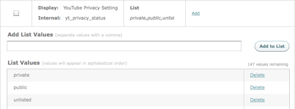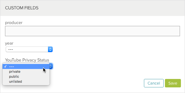 Commencez par ajouter un champ personnalisé à votre compte, yt_privacy_status du type List. Pour plus d'informations sur l'ajout de champs personnalisés à un compte, consultez la rubrique Création de champs de métadonnées personnalisés. Configurer la valeur de ce champ personnalisé contrôle le paramètre de confidentialité de la vidéo YouTube :
