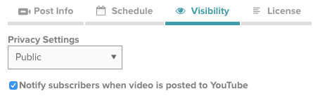 Lorsque vous créez une destination de publication YouTube, l'une des propriétés par défaut qui peut être définie est le paramètre de confidentialité YouTube. Par défaut, il existe trois options : Public, Privé et Non répertorié. Lorsque les vidéos sont publiées sur YouTube, le paramètre de confidentialité de toutes les vidéos est défini sur le paramètre sélectionné.